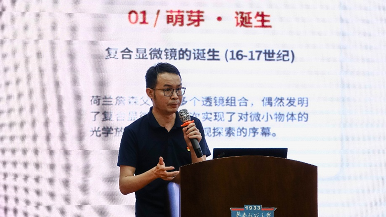 开幕式上,研究院先进材料教工党支部党员、副研究员田国以《从“看见原子”到“驾驭功能”》为题开展讲座,讲座立足材料科学发展前沿,围绕微观表征技术的历史演进、核心原理与现实应用展开系统讲解。田国还特别介绍了我国在原子力显微镜等高端科学仪器领域的发展历程,展现了我国科研工作者面向国家需求、坚持自主创新、不断攻克关键技术难题的奋斗历程,让现场师生更加直观地感受到微观表征技术在推动材料科学发展中的重要作用,也进一步激发了大家投身科研、矢志报国的激情和信心。